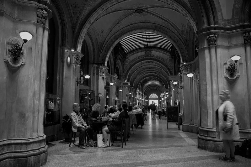 Café Central’ın bulunduğu Ferstel Sarayı’nda bulunan pasaj. Fotoğraf: © Muratcan Gümüş, Ağustos 2017.
