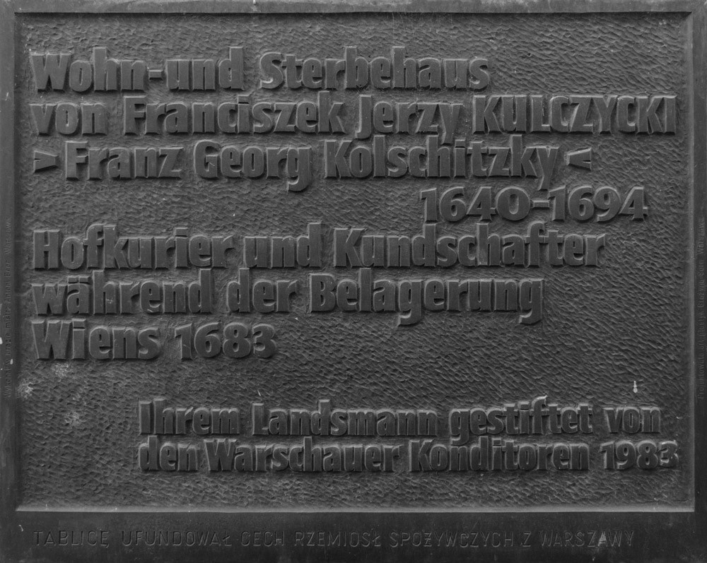 Kolschitzky’yi bir Polon olarak sahiplenen Polonyalı pastaneciler birliği 6 Eylül 1983 tarihinde Kolschitzky’nin doğduğu ve öldüğünü varsaydıkları Domgasse 8 numarada bulunan evin girişine aşağıda fotoğrafı bulunan levhayı astırırlar. [9]