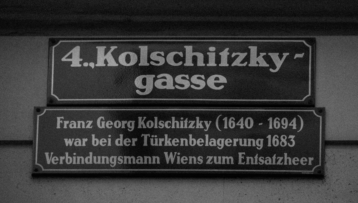 Şehrin IV. bölgesinde bulunan ve Franz Georg Kolschitzky’nin ismini taşıyan sokağın levhası. Fotoğraf: © Muratcan Gümüş, Aralık 2018.