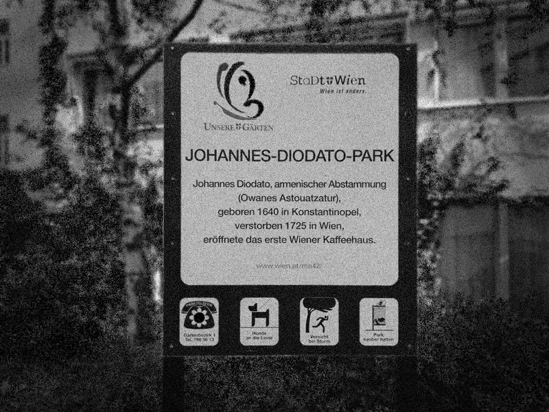 Viyana’nın ilk kafesini kuran Johannes Diodato’nun ismini taşıyan ve şehrin IV. bölgesinde bulunan parkın bilgilendirme levhası. Fotoğraf: © Muratcan Gümüş, Mayıs 2018.