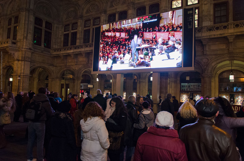 Viyana Devlet Opera Binası’nın (Staatsoper) hemen yan tarafına kurulan bu dev ekranda insanlar bir önceki yıla ait görüntüler eşliğinde dünyaca ünlü Viyana Flarmoni Orkestrası Yeni Yıl Konseri’ni (Neujahrskonzert) seyretme imkanına sahipler.